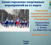 Городские соревнования по лыжным гонкам «Снежинка». Начало мероприятия: 11.00. Место проведения: Лыжная база «Метелица», г. Томск, ул. Королева, 13.