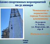 Чемпионат и первенство города Томска по альпинизму (ледолазание - скорость). Начало мероприятия: 10.00. Место проведения: г. Томск, Ледодром, ул. Королева, 36, стр.8.